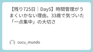 Uncategorized 【残り725日|Day5】時間管理がうまくいかない理由。33歳で気づいた「一点集中」の大切さ